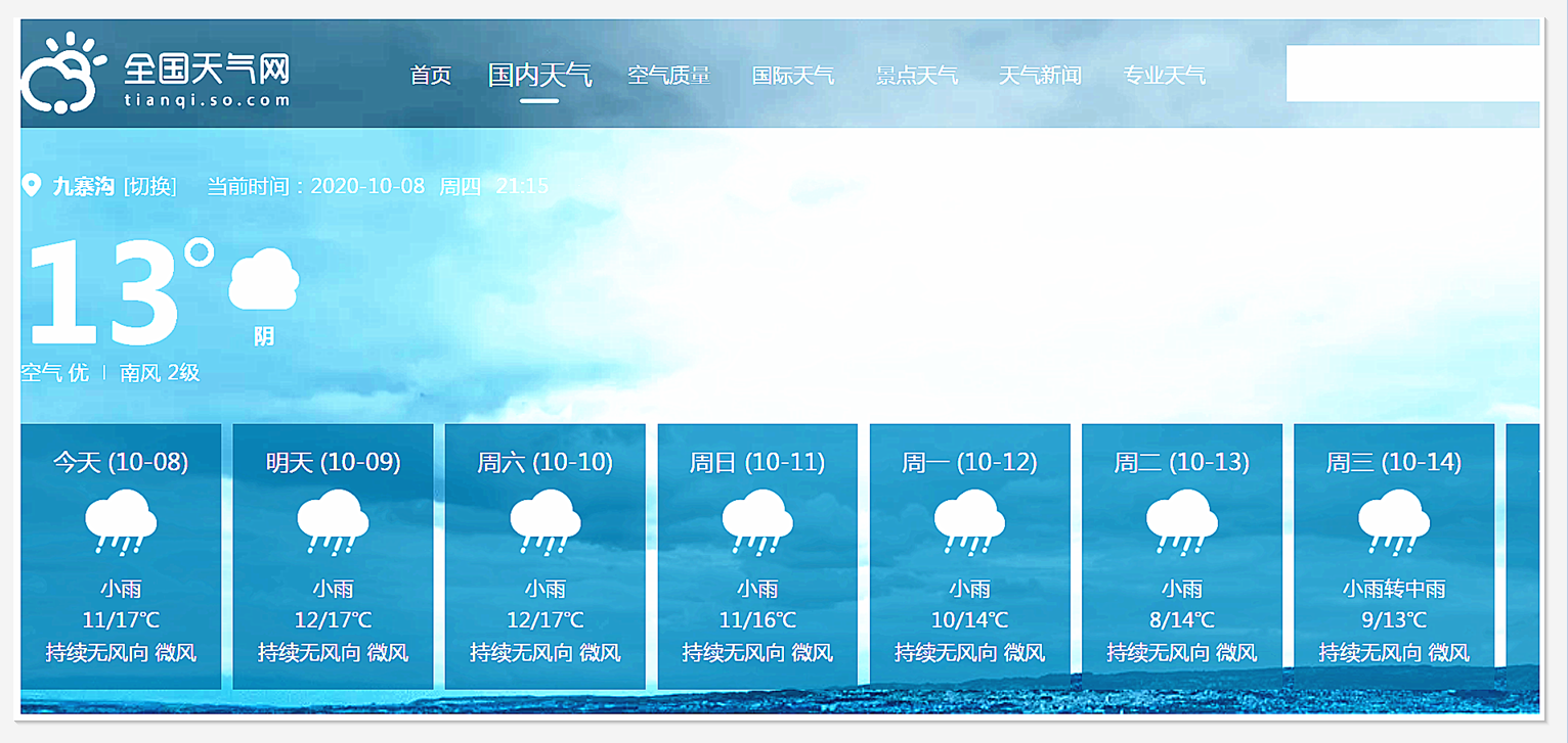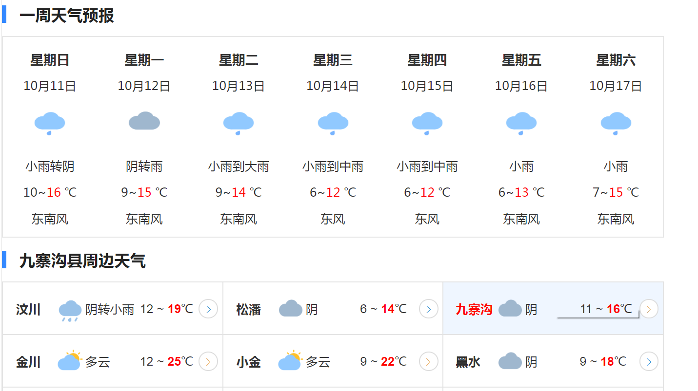 九寨沟15天天气预报 日期 天气预报 气温 风向 风力 10月08日 星期四 小雨 11°C~17°C 无持续风向 小于3级 10月09日 星期五 小雨 12°C~17°C 无持续风向 小于3级 10月10日 星期六 小雨 12°C~17°C 无持续风向 小于3级 10月11日 星期日 小雨 11°C~16°C 无持续风向 小于3级 10月12日 星期一 小雨 10°C~14°C 无持续风向 小于3级 10月13日 星期二 小雨 8°C~14°C 无持续风向 小于3级 10月14日 星期三 小雨转中雨 9°C~13°C 无持续风向 小于3级 10月15日 星期四 雨 6°C~11°C 东风 小于3级 10月16日 星期五 雨转阴 6°C~12°C 东南风转西北风 小于3级 10月17日 星期六 阴 8°C~17°C 南风转西南风 小于3级 10月18日 星期日 雨 10°C~15°C 东北风转东南风 小于3级 10月19日 星期一 雨 10°C~15°C 东风转西南风 小于3级 10月20日 星期二 雨 11°C~16°C 南风转西南风 小于3级 10月21日 星期三 多云转雨 12°C~19°C 东南风转南风 小于3级 10月22日 星期四 雨 5°C~18°C 东北风转北风 小于3级 九寨沟15天天气预报