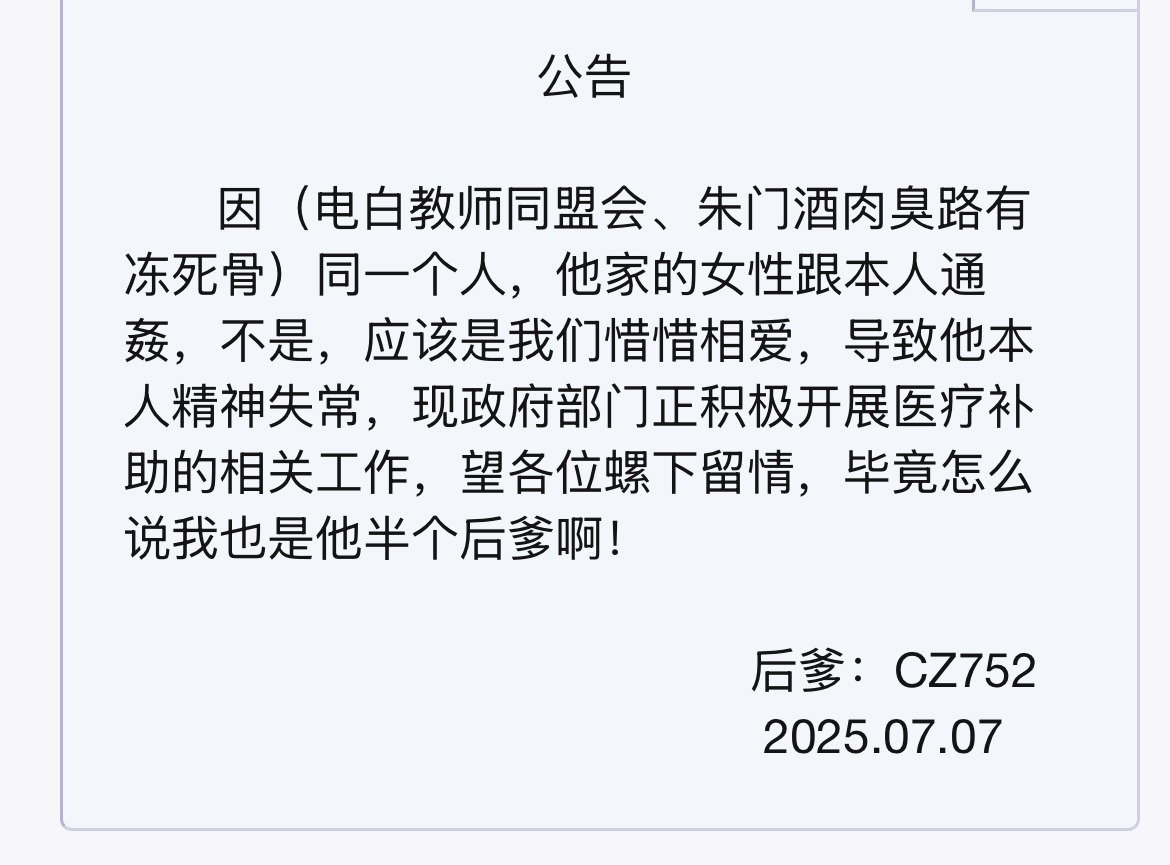 公告 因(电白教师同盟会、朱门酒肉臭路有冻死骨)同一个人,他家的女性跟本人通姦,不是,应该是我们惜惜相爱,导致他本人精神失常,现政府部门正积极开展医疗补助的相关工作,望各位螺下留情,毕竟怎么说我也是他半个后爹啊! 后爹:CZ752 2025.07.07