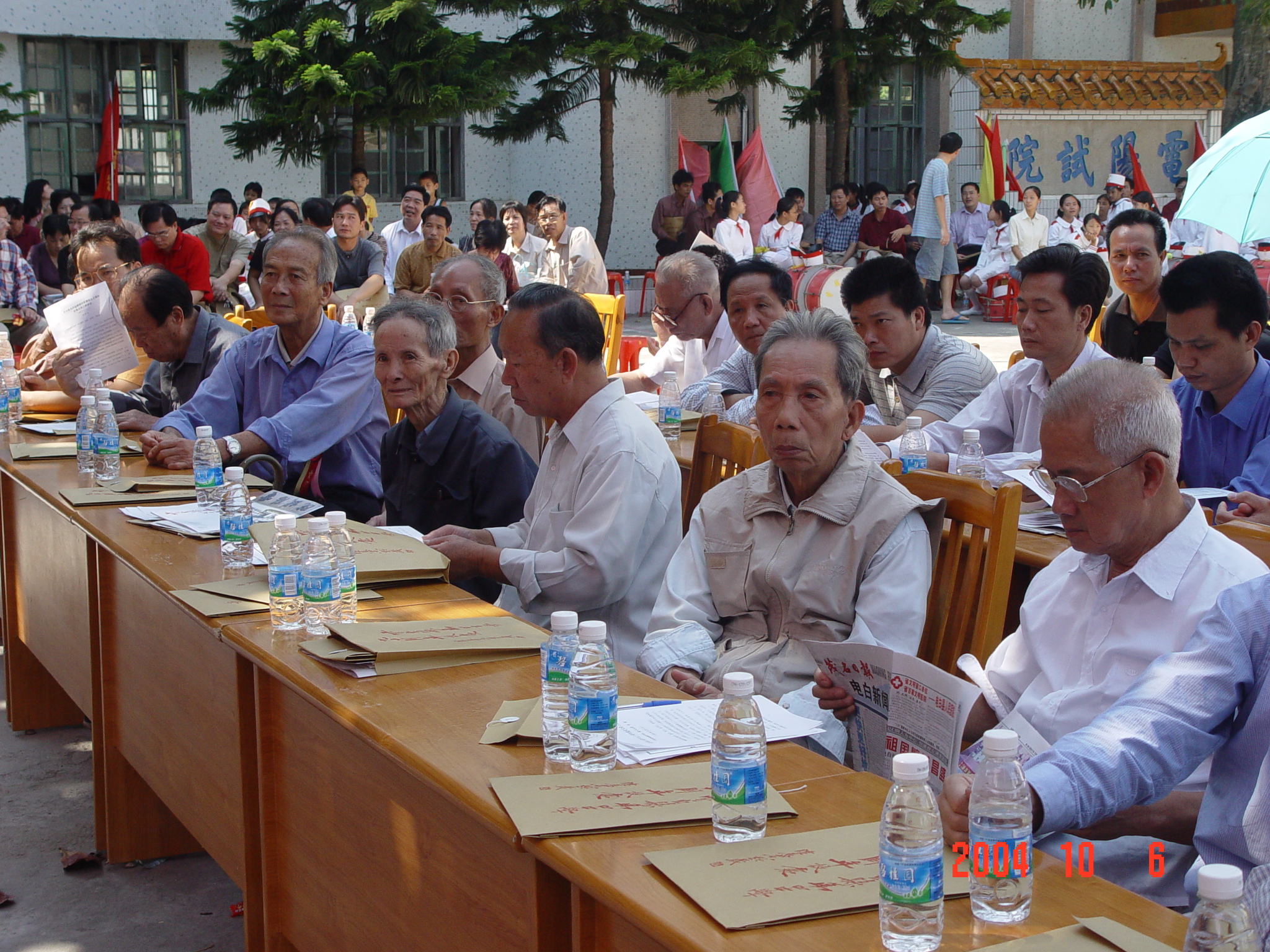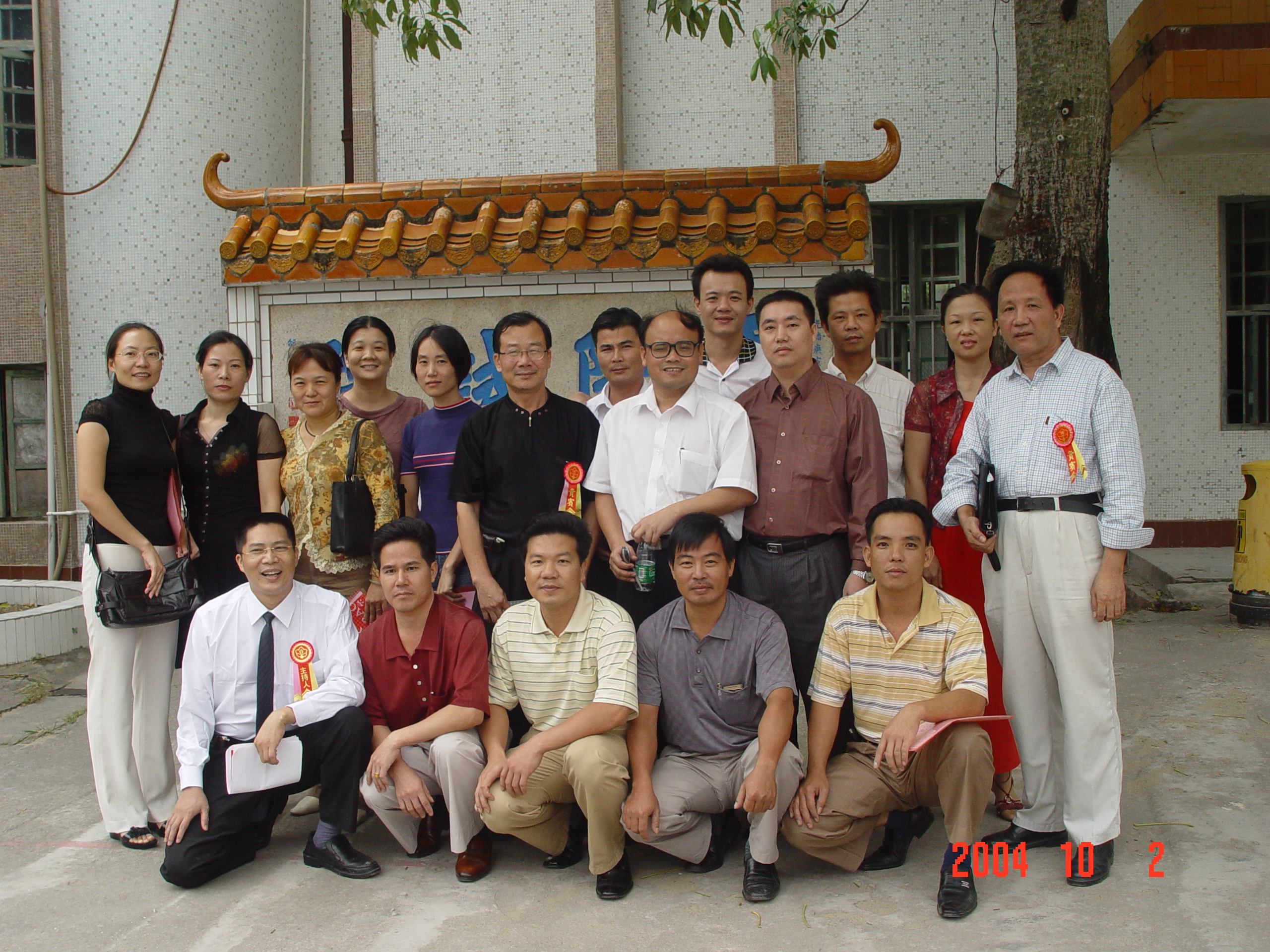 2004年12月5日,在深圳召开的同乡会大会上,吴超成校长颁发纪念品给为母校作出贡献的校友,左起:蔡得、李灏、陈兆东、吴超成。