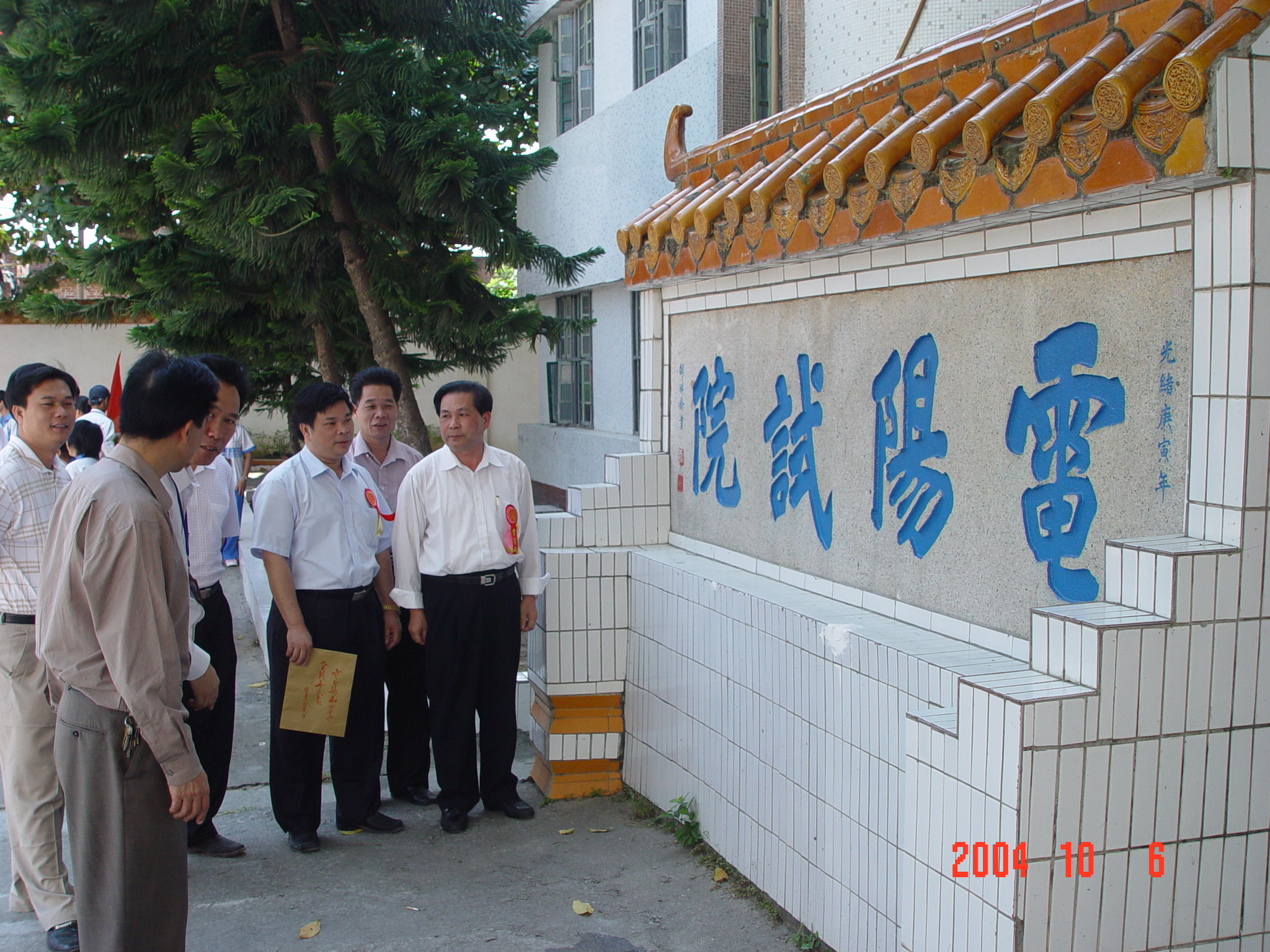 1995年汪致祥校长重新规划了校园建设,建起了“电阳试院”的碑坊和碑记以作纪念。1995年冬建起了由叶春强、蔡得等校友捐资的校门。1995年至1997年,高考、中考和学科 竞赛都取得好成绩,学生崔胜志被中国人民大学录取;易成武被广东医学院录取后,经考核被送到南洋理工医学院留学。占小莹在中考中获茂名市总分第一名。