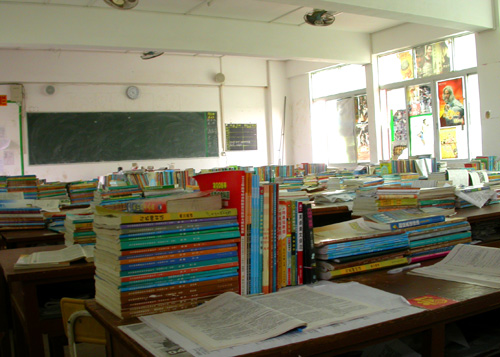 当年高三的体育班连桌子都没多少张,更不用说这么多书了,现在的学生真勤奋!