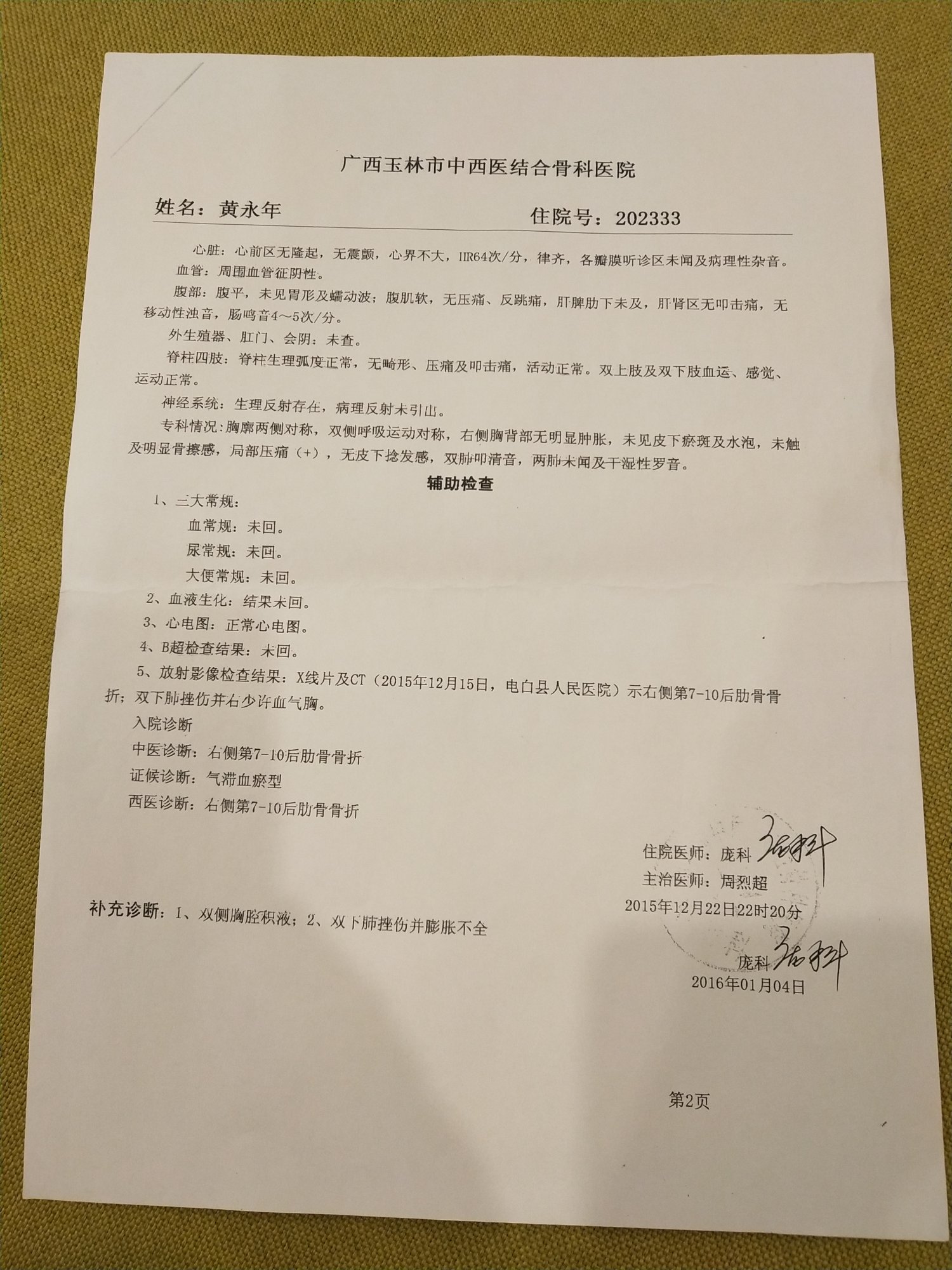 由于伤情严重,本人于2015年12月22日转诊广西玉林市中西医结合骨科医院。截至2016年1月4日出院,本人共花去医疗费40000多元,并造成其他经济损失10万多元。