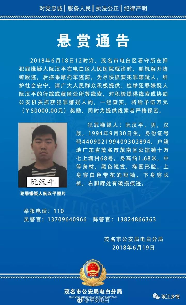 #悬赏通告# 2018年6月18日12时许,茂名市电白区看守所在押犯罪嫌疑人阮汉平在电白区人民医院就诊时,趁机解开脚镣脱逃,后搭乘摩托车逃离。为尽快抓获犯罪嫌疑人,维护社会安宁,请广大人民群众积极提供、检举犯罪嫌疑人阮汉平的行踪或藏匿处所等线索,对积极提供线索或协助公安机关抓获犯罪嫌疑人的,一经查实,将给予伍万元(¥50000.00元)奖励,同时为提供线索者严格保密。