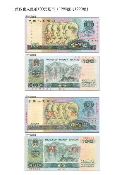 (一)第四套人民币100元纸币。其主色调为蓝黑,正面图案为毛泽东、周恩来、刘少奇和朱德四位领导人的浮雕像,背面图案为井冈山主峰。