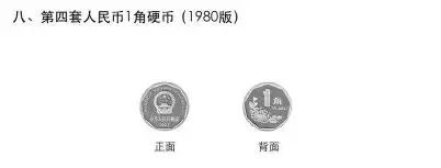 (八)第四套人民币1角硬币。其材质为铝镁合金,正面图案为国徽、国名、汉语拼音国名、年号,背面图案为菊花、面额。