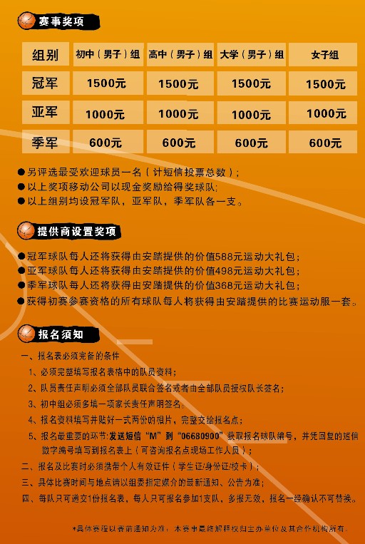 电白动感地带三人篮球赛即将拉开序幕! 奖金高达1500元,还有安踏公司提供的价值588元的运动大礼包!快快来参加啦! 详情请咨询当地移动服务厅;或加入QQ群:48305540