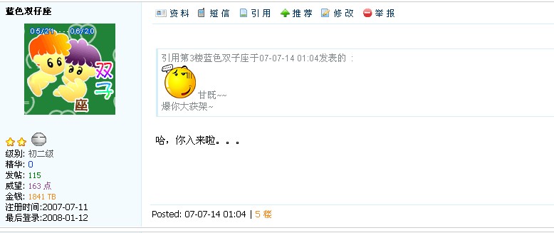首先,蓝色双子座,在未曾认识海的马甲的时候,蓝色双子座是用现在的头像的.后来,双子座与马甲在网络上认识了,马甲就注册上了与双子座相似的名字,叫做蓝色双仔座.后来他们相恋后,马甲便为双子座和自己换上了一张浪漫的手拉手图.如图所示