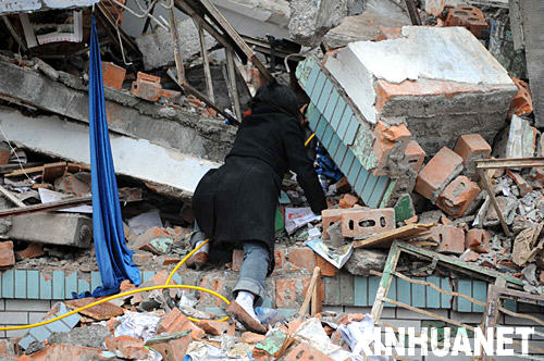 一位母亲在呼唤尽快救出埋在废墟中的儿子。 新华社记者 李晓果 摄