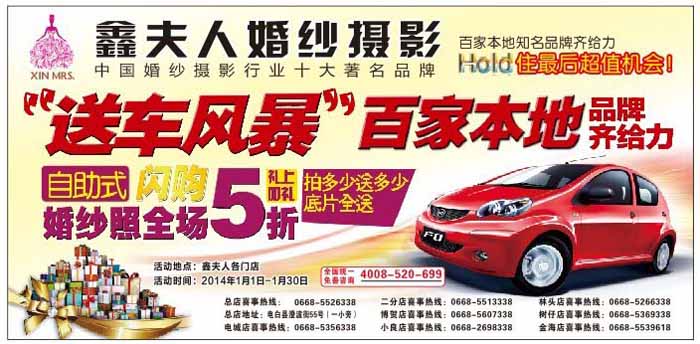 12月28日8:28分电白鑫夫人第8分门市店和婚纱礼服馆即将同时在东湖金海购物广场横空出世,盛大启航,神密面纱即将揭开,这是一场璀璨夺目、空前浩荡的洗礼,2013鑫夫人婚纱礼服馆来了,2014还会远吗?