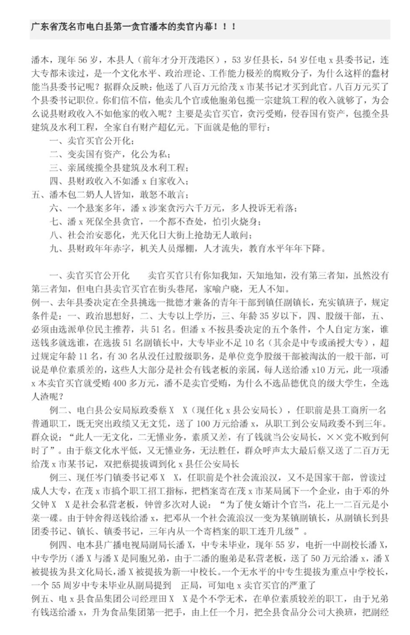 举报人:伍时芳,中共党员,原电白县旦场人大主席。举报人手机:13642410631