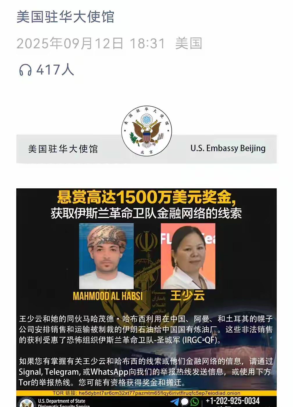 美国悬赏 1500 万美元缉拿王少云…