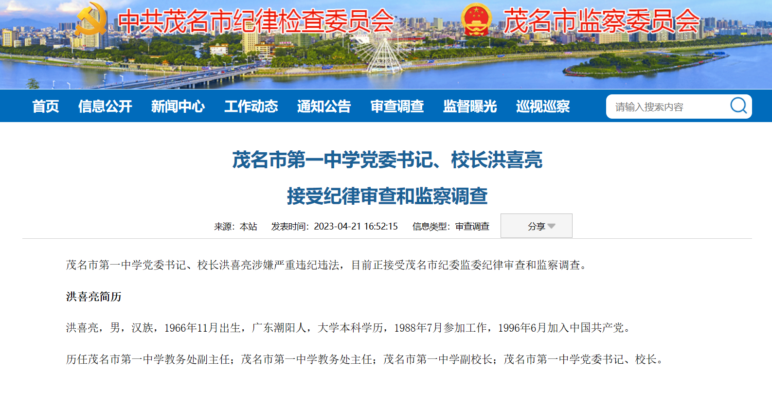 广东省茂名市人民政府教育督导室主任廖建诗涉嫌严重违纪违法,目前正接受茂名市纪委监委纪律审查和监察调查。