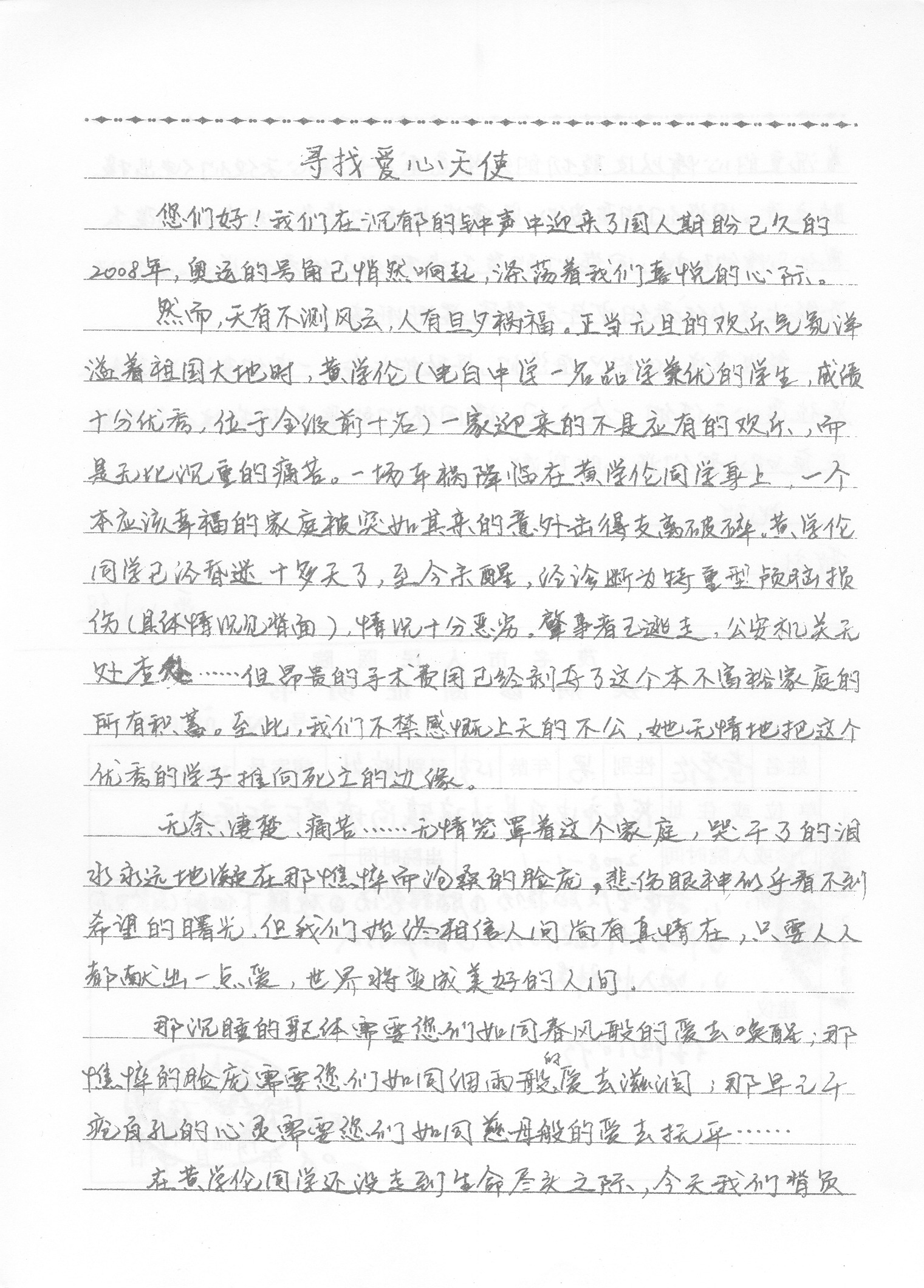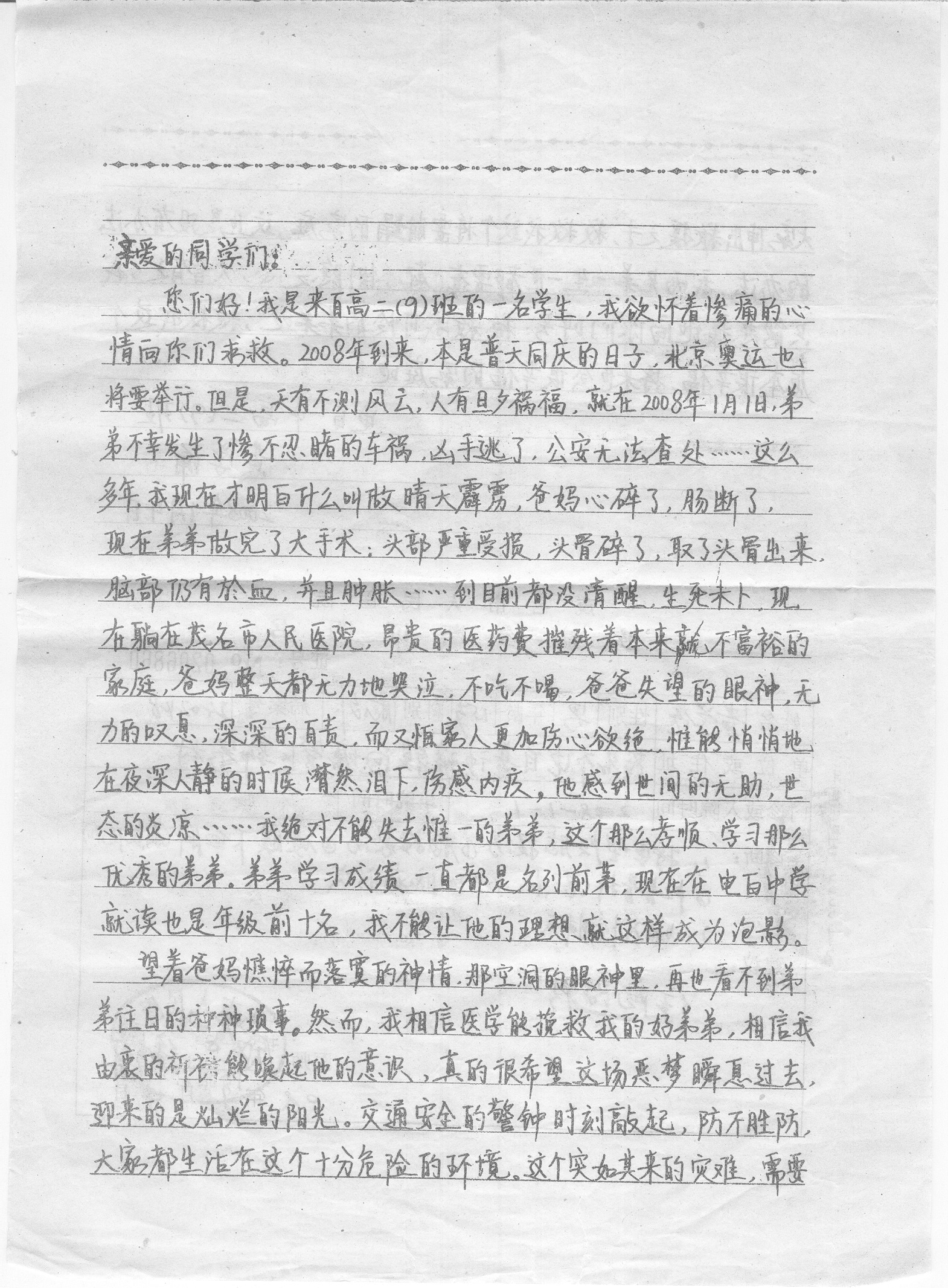 以下你看到的为黄学诵所在的电白一中高二9班班委写的募捐书。