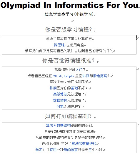 为了不和学校制定的返校计划相冲突,我们的小组学习将持续三个星期。 这里简单说一下学习的课程:语言:pascal,c/c++;算法:基础类的(排序,模拟,贪心等),高级的(DP,回溯,图论等);数据结构:基础的(队列,栈等),非线性的(树,图等)。大部分数据结构结合算法学习,同时我们的培训还会加入网络安全方面的讲解。 如果你是真正热爱编程的,而且想拥有这一门知识。请垂邮:ekjiken@yahoo.com.cn 或造访我的blog: http://jackcui.77733.net